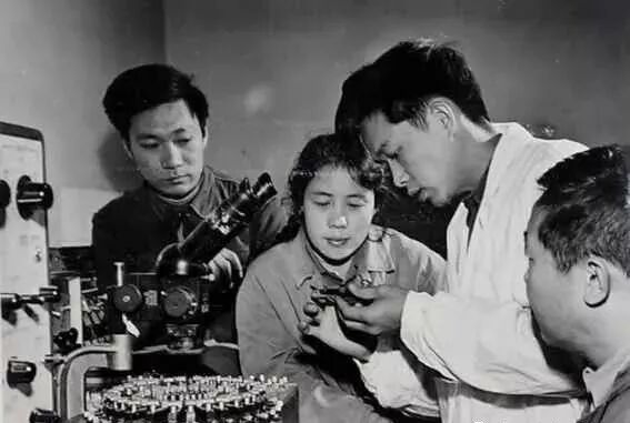 中国科学院半导体研究所科研人员王希平(右二)和工人一起研究多头探针测试台的改进方案。他勤奋攻关,和工人协作,设计试制了多种半导体工艺设备。