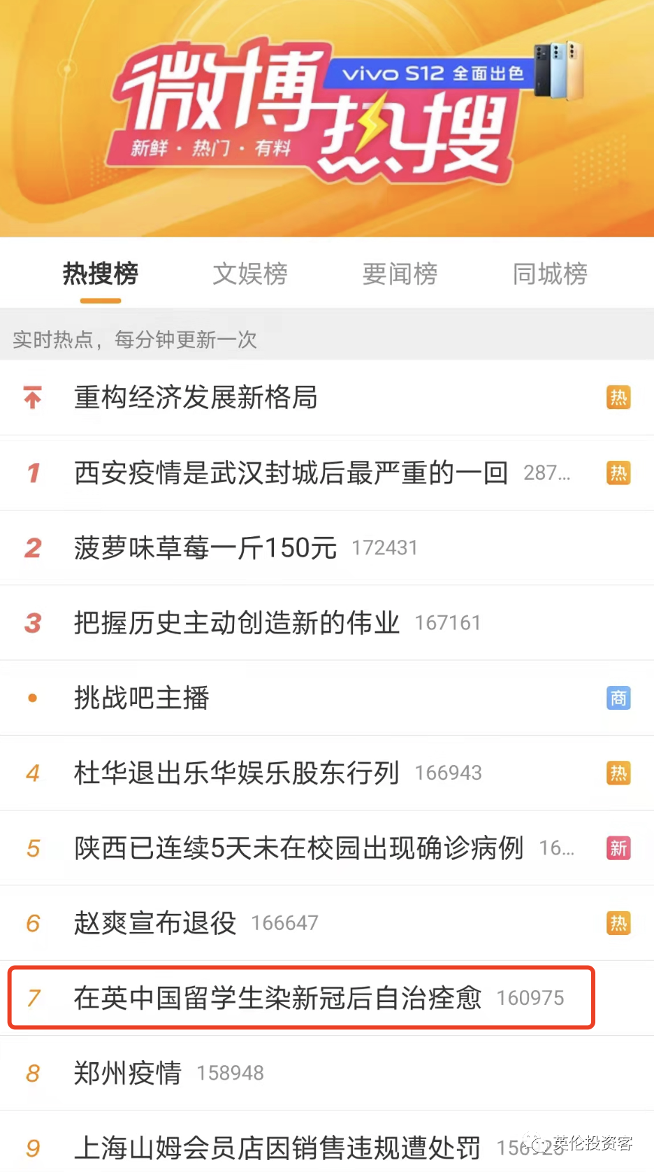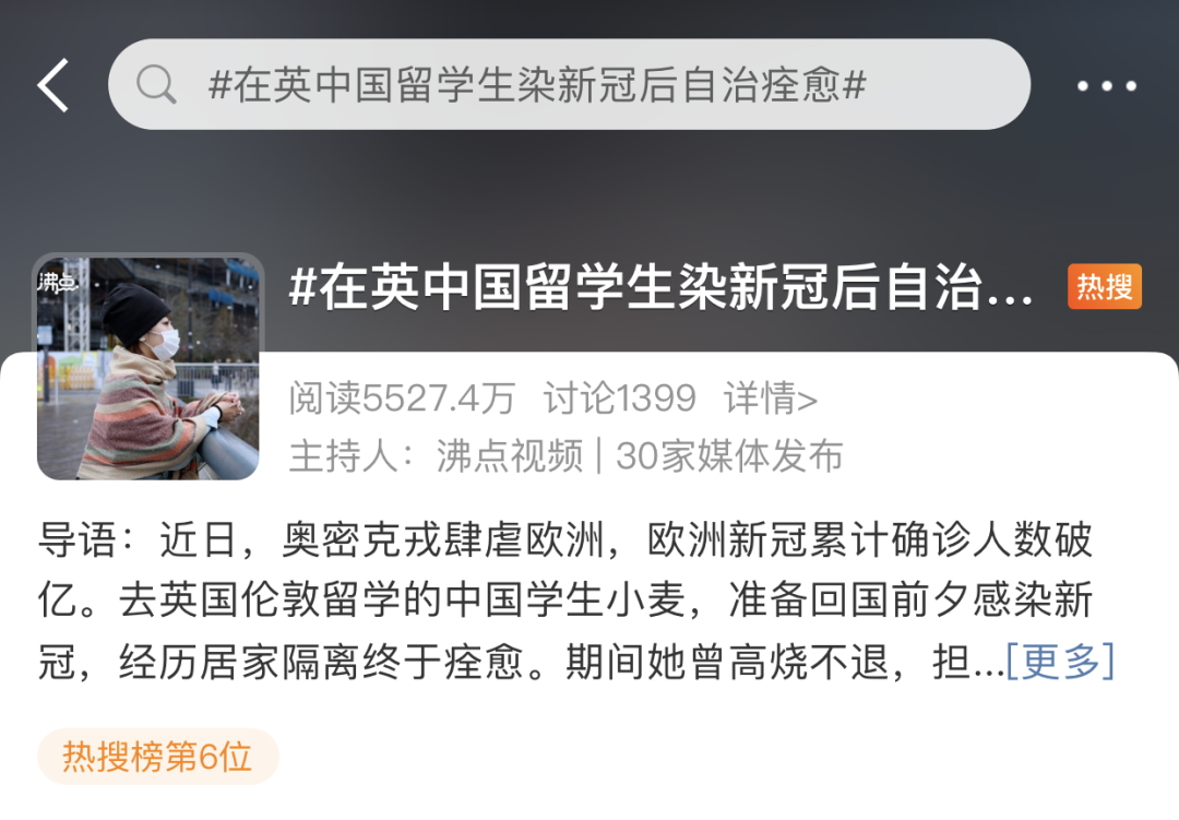 热搜词条是#在英中国留学生染新冠后自治痊愈#,主要讲的是中国留学生在英国感染新冠后自愈的事。